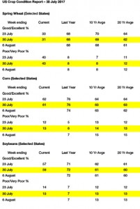 - Today has been described as “a bloodbath” in Chicago as soybean markets posted sizeable losses with the Nov ’17 contract falling below its 200 day moving average ($9.85) with corn and wheat markets following in harmony. The rise in weekly soybean crop condition (see above) together with the prospect of “normal” Midwest rainfall beyond 10 August, was sufficient to spark fund selling and position liquidation. $9.63/bu is the next downside target (Nov ’17 soybeans) at an open chart gap. Dec ’17 corn is toying with an uptrend line $3.76/bu whilst wheat support is noted at or just below $4.70, and this is currently breached.