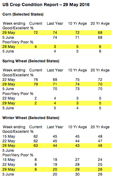 - Corn planting in reported to be 94% planted, up from last week’s 86%, and above the five year average of 92%. Soybeans are 73% planted, better than expected and up from last week’s 56%, and above the five year average of 66%.