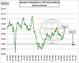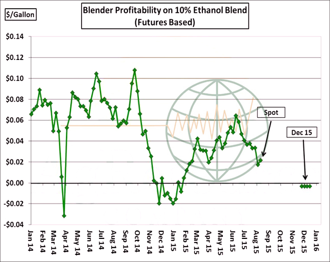 - The ongoing decline in crude and gasoline is expected to weigh on ethanol production and blending longer term. ARC has no major disagreement with the USDA’s new crop 5,275 Mil Bu corn used for ethanol forecast, but the issue ahead surrounds discretionary blending. New crop ethanol production margins are calculated at just $.15/Gal, and futures-based blend margins are slightly negative. The incentive to produce above government mandates is lacking, and ethanol prices are expected to drop further over time.