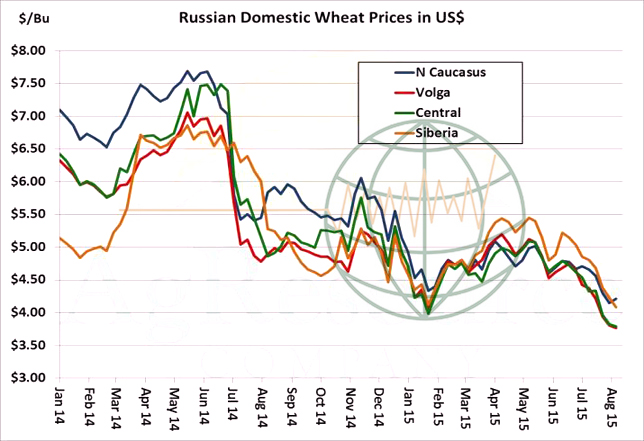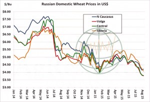 - US futures ended steady to 5 cents higher on Friday and settled down 5-8 cents on the week. There’s little fresh news available, but the session was marked by funds buying grains and selling soybeans amid ongoing improvement in next week’s Central US weather forecast. We continue to believe that rallies in the weeks ahead will be short-lived – Gulf SRW basis rallied sharply this week, which along with support in the futures market has further widened the US’s premium to other origins. Russian domestic prices in US$ terms, as evidenced in the graphic below, have fallen to seasonal lows and range from $3.75-4.20/bu. Australian weather will increase in importance beginning in late August, and following recent rainfall a drier than normal trend is offered to Southern and Eastern production areas in the next ten days. But there’s been no end to declining Black Sea cash markets of late, and some are now pegging the Aussie crop at 24 million mt, unchanged from ABARES’ first estimate in spring. New fund long positions hinge upon an Australian drought in September. Fundamental resistance is pegged at $5.20 basis December ’15 Chicago futures.