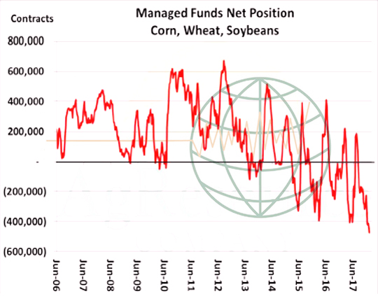 - Funds have entered into a new record short ag futures position of -473,000 contracts, an increase of 29,000 contracts in the holiday shortened week. The net short in US soybeans surged to -103,400 contracts with the combined grain (Chicago corn and wheat) at -370,000 contracts. The hefty fund short opens upside price risk should any bullish supply shock develop. World farmers have to be sellers of supply if Chicago prices are to be pressured substantially in the weeks ahead.