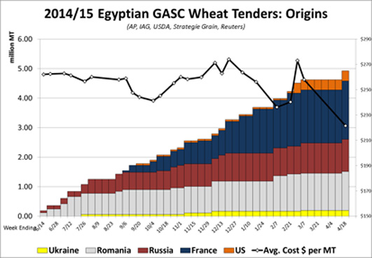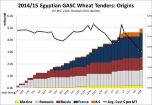 - Over the weekend we saw Egypt return to the wheat tender market for the first time since February 3rd, and they picked up 300,000 mt with 180,000 mt from France and 60,000 mt each from Russia and Romania.