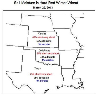 - US hard red winter wheat producers in the top three states report a worsening of crop condition with 27% reaching good/excellent and 34% poor/very poor with 39% reported as fair. Soil moisture has declined in recent weeks with little rainfall in the region in the last fortnight. It appears that Texas has seen particularly arid conditions as growers report 75% short or very short of topsoil moisture.