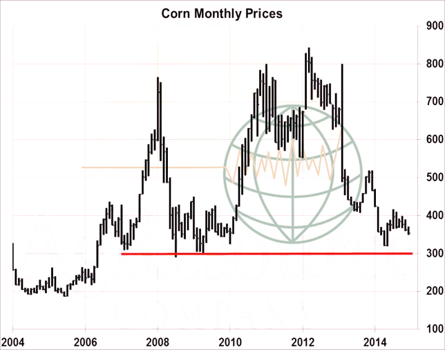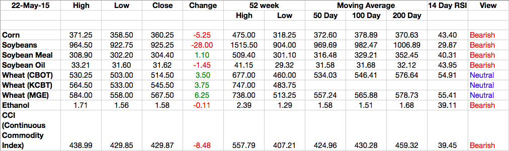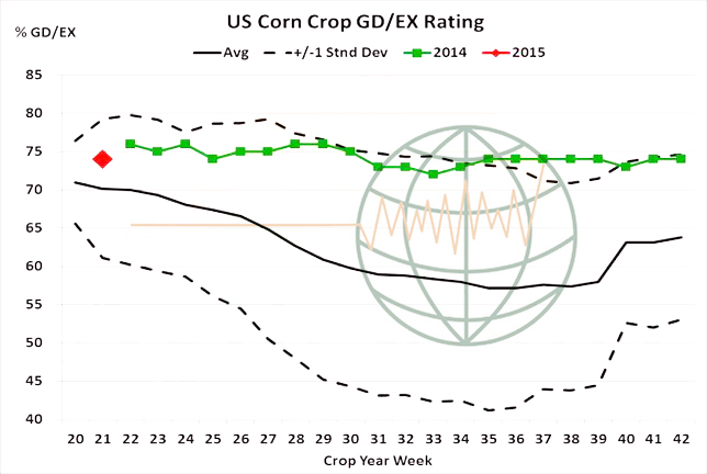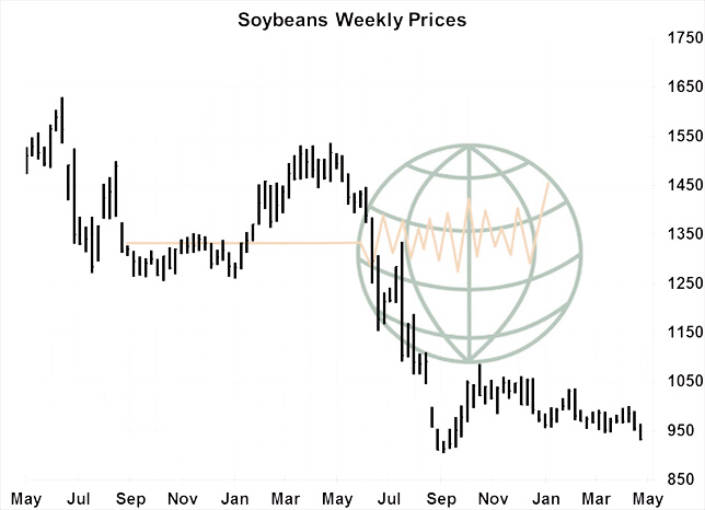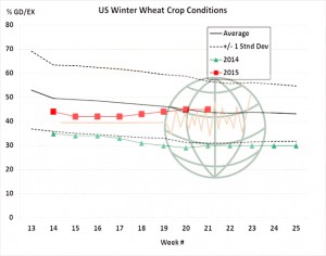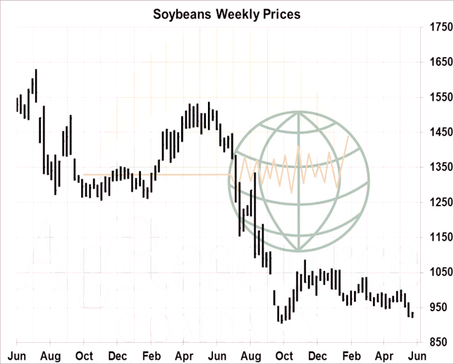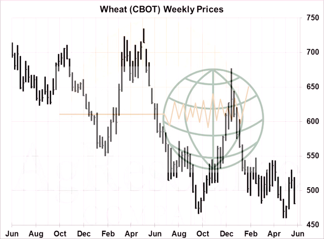 World wheat futures ended sharply lower this week. Concerns over dryness in Russia and Canada have been mostly removed as rains have begun to fall across SE Russia and as forecasts into mid-June maintain near normal precipitation and temperatures. Egypt’s first purchases of the new international marketing year also validated Black Sea/E European cash prices at $190/MT, which is well below US Gulf offers. With forecasts improving, it’s back to attempting to boost US exports though Gulf premiums remain much too expensive. Our outlook is little changed, and ultimately world cash offers are projected to reach $170-175/MT by July. Russia looks to have a very marginal export tax beyond July 1 ($1/MT, with higher levels kicking in if world prices exceed $220). This is not expected to materially affect trade flows. We remain bearish and spot futures will likely range from $4.25-5.25 through the next six-nine months. How low prices reach depends on the value of the Ruble relative to the US dollar in July/August.