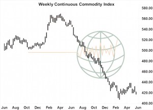 The CCI/CRB index finished the week lower even with a fall in the US$ on sliding grain and energy prices. The week ahead will be important as fund managers head into the end of the month and quarter. Amid US and Asian equity prices that are pushing to new record highs, commodities as an investment continue to fall out of favour. The recent rally in the CCI index appears to be corrective in nature and the US$ should rally regardless of the outcome of the Greek debt payment which is due on June 30th. At a minimum, the CCI index should retest contract lows by late summer or early autumn. Our view continues to remain bearish commodities. The world energy market should have scored its seasonal high with WTI crude above $62. A lower close in the week ahead would be deemed bearish heading into July.