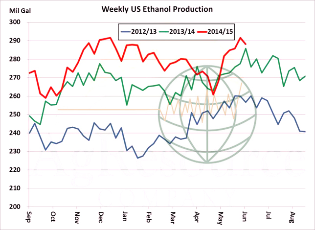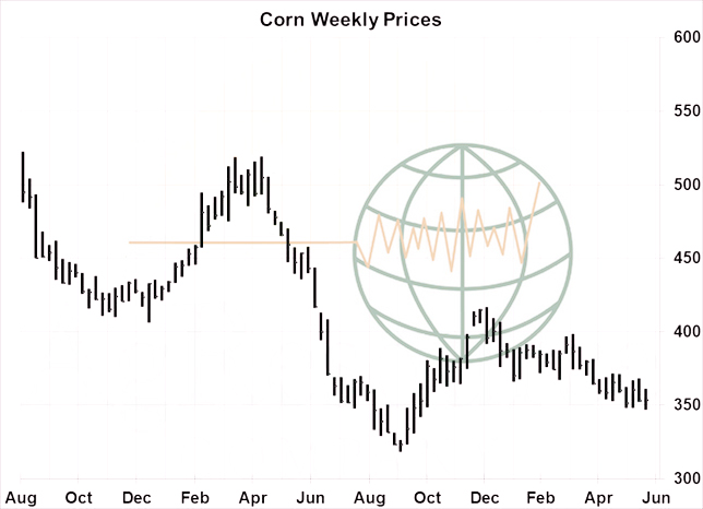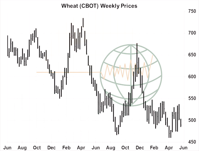 Corn futures this week ended unchanged. Strength was noted early, but US favourable longer term weather forecasts continue to trump uncertainty ahead of NASS’s Stocks and Seedings report. Heat/dryness is noted across the Delta/Southeast, with modest yield loss likely. But this will be offset by near record high crop ratings across the Central Corn Belt. NOAA projects July to be cool/wet across the whole of the Central US – driven by El Niño – and the trade is well aware of the positive effect cooler than normal temperatures have on Midwestern ear weights. Some weather premium was added early in the week, but potential for record/near record yields remain. Otherwise, little has changed. Gulf corn becomes uncompetitive beyond July. Black Sea weather is improving. June 1st stocks are projected some 850 larger million bu than last year. We maintain spot and new crop futures will drift slowly lower if favourable weather is confirmed beyond July 1.