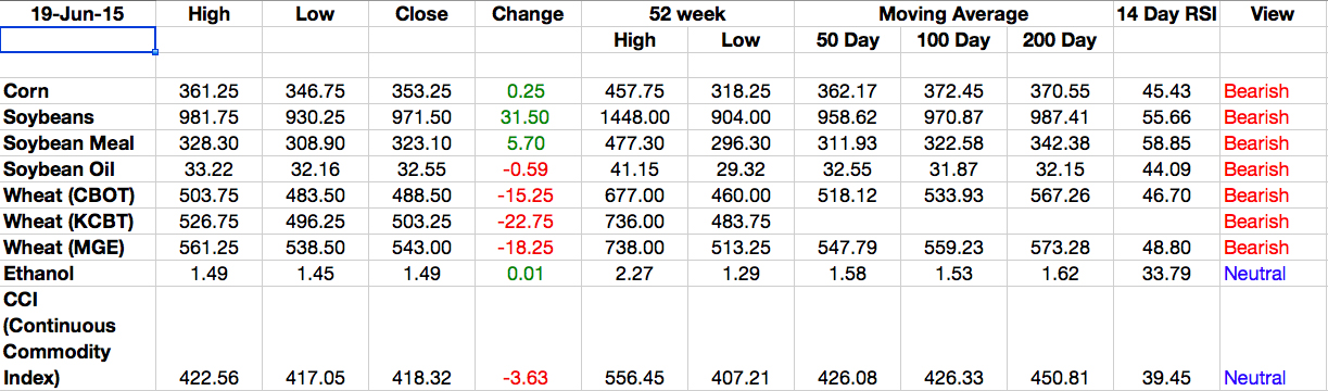 Wheat futures ended down 15-23 cents, with HRW contracts pacing the decline amid favorable S and C Plains harvest weather projected into the end of June. Much of Western and Central Europe has benefited from needed rainfall in the last 5-7 days, while Australia – despite El Niño – has seen soaking rainfall in the East, with similarly heavy rains offered to Western Australia in the coming days. With funds having liquidated a sizeable portion of their net short position in mid-June, it’s back to fine-tuning world production figures and determining just how much the Black Sea will export in the next 4- 5 months. World fob price spreads have narrowed, but a range of $4.50- 4.70, basis spot Chicago, is needed for Gulf SRW to compete against Russian and EU origins. US HRW is still a long ways off from finding any non-traditional business. Seasonal lows lie in the offing, but rallies will be hard-fought without extreme heat/dryness across Argentina and Australia in Aug/Sept. Rallies to $5.30-5.40, basis Chicago, are opportunities to catch up on 2015 and 2016 forward sales or to open/add to short positions.