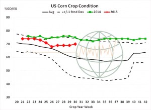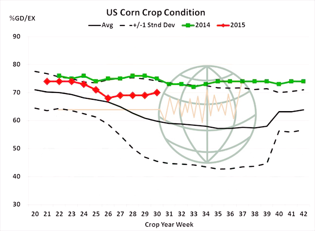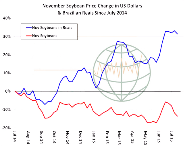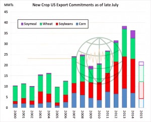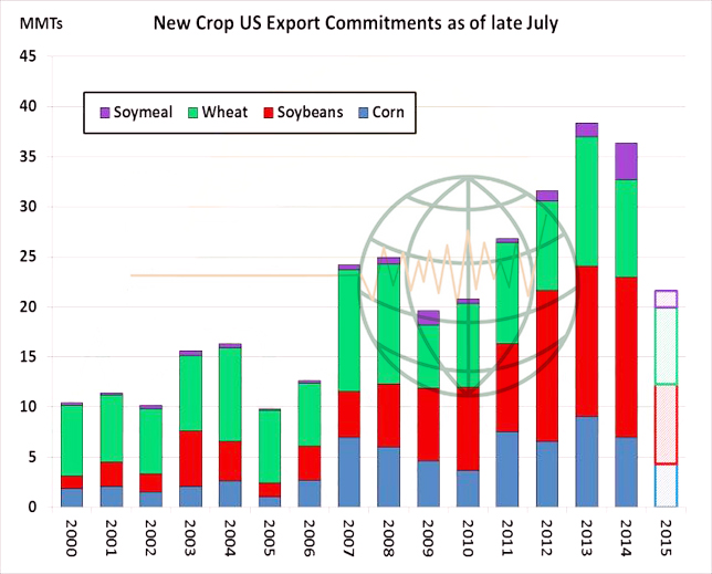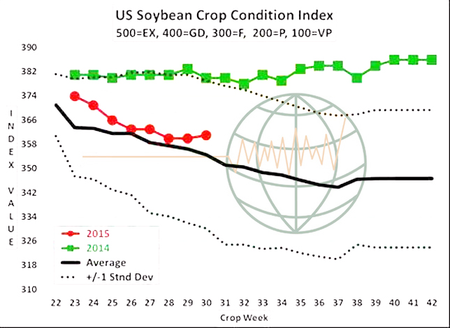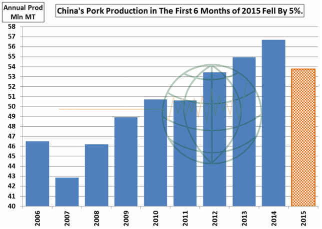 - The IMF, in its latest outlook, projects a decline in the rate of growth of China’s total GDP and in per-capita GDP in the coming years. Per-capita GDP is projected to increase 7.5% in 2015 and just over 6% in 2016. Growth will still occur, but this is notable change from annual boosts in income of 10-30% seen since the early 2000s. Declining marginal economic growth, coupled with farm policies that encourage production – but also imports – has triggered a huge surplus of commodities in China, most notably in wheat and feedgrains. Chinese corn and soymeal futures – solid agricultural indicators – have been in retreat in recent months, with corn having plunged some 20% since early May. China’s growing appetite for meat during its unprecedented rise has been a boon to global grain and oilseed markets, most notably soybeans. In recent years, strong Chinese import demand for soybeans has been the only thing (or certainly the main thing) supporting and driving prices higher. However, discouraging signals are starting to appear. According to the Chinese National Bureau of Statistics, pork production in the country fell by 5% in the first 6 months of 2015.