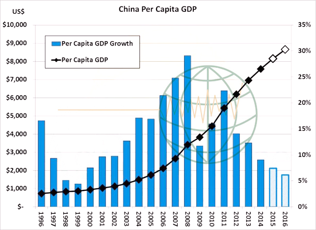 - China has roughly had 1.3 billion people since they installed their “1 child policy” in the early 1970s. The world agricultural community has been counting on China’s huge population to be the saviour of agriculture. However, it was not until the early 2000′s that China became a WTO member and a significant importer of a host of commodities – including energy, ags and metals. This growth in Chinese import demand correlates with China’s rapid increase in GDP rates beginning in 2001/2002. When China’s GDP rates went from $1,000 per person to nearly $8,000 today, China’s demand for soybeans and a host of other commodities exploded. The question going forward is whether China’s soaring per-person GDP rates can be sustained for the next five years. This is the issue everyone involved with global commodity markets should be looking at very closely.