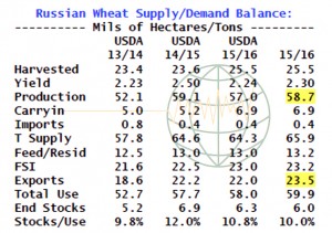 - In Europe, Matif wheat ended higher on a weaker €uro although cash premiums were pretty much unchanged. The EU export pace (see above) would suggest an annual figure in the region of 22 million mt, which is too low but overall demand (as we have stated ad nauseam) is clearly down at present. There will also likely be less for export based upon the suggested increase in feed wheat consumption. It seems that there is, and will be, more feed wheat supplies across the Ukraine to Bulgaria region than last year, and also more than originally anticipated. However, N France is without doubt experiencing a wheat protein deficit, and this may well find a feed home. Given last year’s EU corn crop plus imports of 85 million mt would result in a like for like import figure of 25 million mt basis the anticipated 60 million mt crop. To avoid a 25 million mt corn import figure it is becoming more and more likely that Europe will feed more wheat (and barley where possible) and reduce corn imports year on year. This will result in reduced EU wheat exports, and our current thinking is that we will see a figure closer to 25 million mt rather than the USDA’s current 31 million mt estimate.