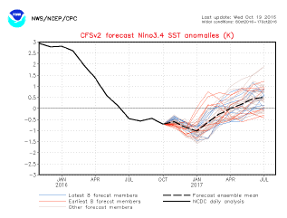 - The weather community over the last week or so has been abuzz over a cooling equatorial Pacific and rising odds that La Niña will be established through winter and early spring. Indeed, forecasts have trended such that La Niña is fully expected, but just how long it lasts will be important to 2017/18 yield potential. NOAA will release its updated seasonal climate and drought outlooks on Thursday morning, and we expect much of the text to center on La Niña odds and duration.