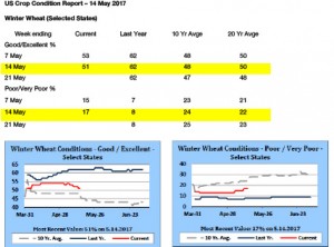 - It would be “normal” at this time of year for volume and/or market activity levels to be high based upon yield risks as we approach the summer period. However, it seems that these risks are not building, indeed they appear to be receding, and the only selling is coming from stale longs in Kansas wheat, which funds are shedding.