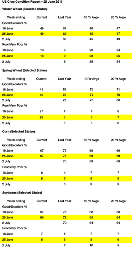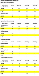 - The much awaited USDA June Stocks and Seeding report offered some mixed results but the market generally took its contents as bullish amid ongoing threats of warm and dry conditions across the Plains and north western Midwest. Chicago wheat, corn and soybeans are sharply higher again.