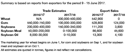 - US June 1st wheat stocks were estimated at 1,184 million bu, the high end of trade estimates and up 208 million bu from last year. Fourth quarter feed/residual is calculated at a -57 million bu which compares to -37 million bu in the year before. June 1st wheat stocks define totals for the 2016/17 crop year.