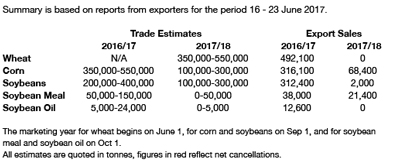 - US 2017 soybean seeding was estimated at 89.5 million acres, virtually unchanged from the March estimate, but up 7.3% from last year to a new record. The states posting the biggest seeding gains were MN with acres up 650,000 acres to 8.2 million acres and N Dakota with soybean seeding up 1.15 million acres to 7,200 million. We would also note that S Dakota soybean seeding was up 200,000 acres to 5.4 million acres. The drought area of the Dakotas has 12.6 million acres of soybeans or 14% of US production. By seeding, N Dakota is the US’s 4th largest soy state!