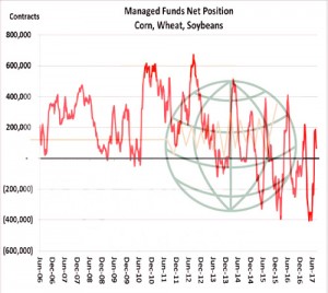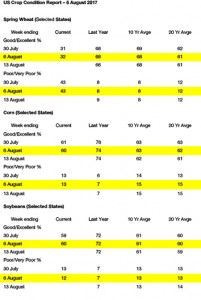 - Black Sea harvest data continues to suggest that Russia’s crop may still be understated by 1-2 million mt, though Russia’s exportable capacity will go unchanged. We also mention that hi-pro milling wheat in Russia has fallen only slightly and comparable Gulf HRW maintains a slight discount to Russia, as well as all other origins. The world market has been inundated with this year’s N Hemisphere winter wheat harvest, but US wheat is viewed as cheap at current prices, which are only modestly above this week a year ago. Breaking news is largely absent. US spring wheat ratings were pegged at 33% good/excellent, vs. 32% last week, but harvest is now 40% complete and what is done is done. NASS’s production forecast is still overstated some 20-30 million bu in our view, which is entirely a function of abandonment. We continue to remain concerned about production in Australia and Canada, and consequently Canada’s ability to ship more wheat to the US.