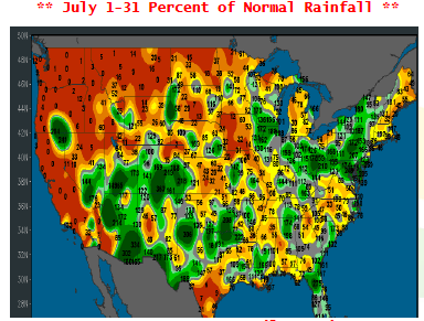 - Soybeans slipped to new lows in early Monday trading and were mostly 5-7 cents lower at the close, but near the highs of the day at the close, while August soybeans were off 10 cents for the day at contract expiration. After the close, NASS reported that 59% of the soybean crop was rated as either good or excellent versus 60% a week ago. Good/excellent ratings increased in 8 states, declined in 7 and were unchanged in 3. The largest increase for the week was in ND (+7 to 44%), and the largest decline was in MI (-7 to 55%). NASS reported that 94% of the crop was blooming versus the 5-year average of 93%, while 79% of the crop was setting pods, ahead of the 5-year average of 75%. Soybeans are now very oversold, with limited confidence in the USDA’s August yield estimates. We expect the market to turn range bound from $9.20-9.60 ahead of next week’s Pro Farmer Crop Tour.