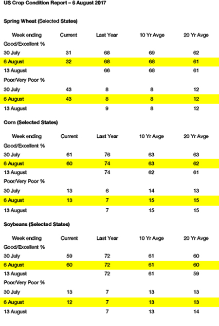 - Chicago corn futures spent a majority of the session in the red, only to end slightly higher by the close. Dec continues to hold major chart-based support, and still there are many questions surrounding US yield potential. Much better rainfall lies in the offing across the Plains and W Midwest, but will it fall in time is the big question. Work continues to suggest that neither the bulls nor bears will be able to sustain much momentum until combine data is available sometime in early Sep. Good/excellent ratings this week improved 2% to 62%, vs. 74% on this week a year ago. Major boosts are noted in CO, TX, NE, IL and IN, which more than offset somewhat surprising declines in KY and MI. IA ratings are down another 3% to 61% (vs. 83% a year ago). This week’s numbers indicate recent rainfall has stabilised yield potential nationally, which at the least will fuel debate on whether yield is closer to 164 or 169. Only harvest data will provide any real clarity.