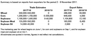 - US and European wheat futures ended higher, and in the US pre-first notice day liquidation has ended. Black Sea cash prices are unchanged, but European values are higher, and still there is talk that Northern Europe’s hi-pro exportable surplus is dwindling fast. On paper, Gulf HRW is more competitive than it was just weeks ago. There is just not a lot of input available to trigger any meaningful selling below $4.10, basis spot Chicago futures. Otherwise, it was a pretty slow news day but more attention will be paid to Plains dryness in the months ahead. The EU and GFS weather models have eliminated the chance of rainfall across the Plains next week. The equatorial Pacific has also cooled dramatically, and some models predict a rather strong La Niña through Jan/Feb, which historically correlates with warmth and dryness across the Southern HRW Belt. Plains soil moisture surpluses are eroding. Like corn, farmers will not be willing sellers at current prices, and a 15-20 cent rally is anticipated.