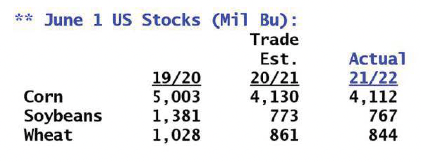 • US June 1 soybean stocks were 767 million bu, down 6 million bu from trade estimates and down 614 million bu from 2020, the smallest since 2015.