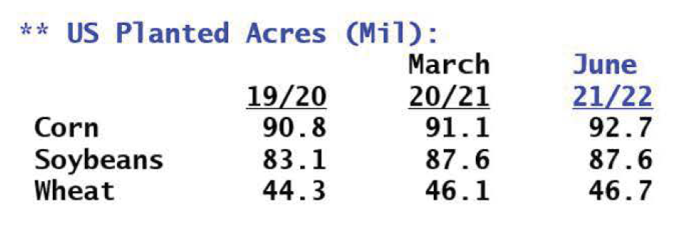 • US 2021 soybean seeded acres held steady with March at 87.6 million acres, which was steady with the March intentions survey. Harvested acres were placed at 86.7 million acres. This was the third largest US soybean seeding pace on record, behind 2017 and 2018. Like corn, the big gains occurred in the Dakotas with North Dakota seeding 7.2 million acres, up 25% and South Dakota up 11% at 5.5 million acres. Texas, Mississippi, Georgia, South Carolina, and Wisconsin acres were also up on a percentage basis substantially. NASS indicated there were 9.84 million acres left to seed when the survey was completed.