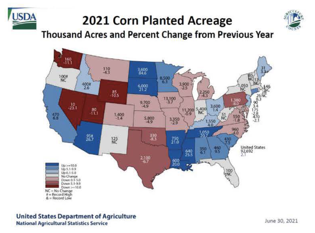 • 2021 US principal crop acres rose to 317.2 million acres, the largest total since 2018 when 319.3 million acres were seeded. The big gains in seeded acres vs 2020 occurred in the Dakotas (North Dakota crop acres up 15.6% to 24.15 million with South Dakota up 8.0% to 16.8 Mil acres). Other Midwest States showed modest seeding gains of 0-2% with Iowa seeded crop acres unchanged from last year. Kentucky cropped acres rose 6% to 5.1 million acres while Nebraska acres fell 2.3% to 19.3 million acres. Kansas held the most cropped acres at 23.5 million acres.