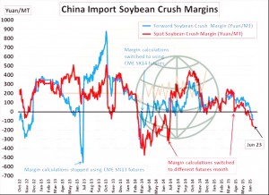 • Chinese soybean crush margins have fallen to their lowest levels in a year with meal prices just off 8 year lows. Reduced Chinese pig numbers and an unprofitable broiler industry have curtailed domestic soybean meal use. What is different from 2014 is that new crop Chinese crush margins are also negative – which along with cheaper Latin American offers is slowing US new crop soybean sales to China. And Chinese crushers are opting for cheaper Argentine soybeans through October. US 2015/16 soybean exports appear likely to fall below that of 2014/15 in our opinion.