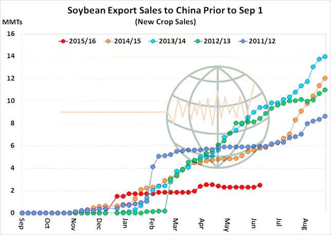 • Crop ratings have dropped in a few states, but the majority of the US crop continues to hold up well above average right now. Currently, the US crop look on track to make 3.75 billion bu and with such a crop the US can ill afford to lose out on further export deals.