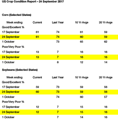 • US wheat futures ended marginally lower, EU and Black Sea cash prices are unchanged, overall the wheat market was rather listless today. We do highlight the recent bounce in spring wheat’s premium to other classes this week. NASS’s final wheat production estimate is due on Friday, and though yield was stabilised during the final throes of summer, it is abandonment that will push US HRS production 15-25 million bu lower, thereby pushing HRS end stocks closer to 120-125 million bu. We doubt much downside risk is left in the spring wheat market, as there is little doubt hefty premiums are needed to ration supply. World wheat price trends are noticeably positive in the Sep-Nov quarter, made evident by the recent rally in Black Sea fob offers, and so spot Minneapolis should find lasting fair value at $6.30-6.80, basis December. Australian forecasts lack any substantial moisture relief into Oct 5th, and a close eye wil needl be kept on continued rainfall in Argentina.