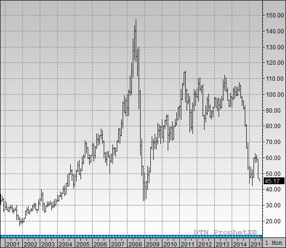 - Crude oil prices fell to sharp losses in recent weeks on oversupply and waning demand. The chart below reflects our expectation that spot crude should bottom between $42-44.00. US rig counts are up and OPEC members are still pushing for world market share. If the $42.00 level is taken out, the next downside price target would be the 2008 lows at $32.50. We have previously suggested that fracking and the new advances in oil extraction argue for spot crude oil to trade between $35-80.00 for many years to come as the market adjusts to the US becoming a net exporter.