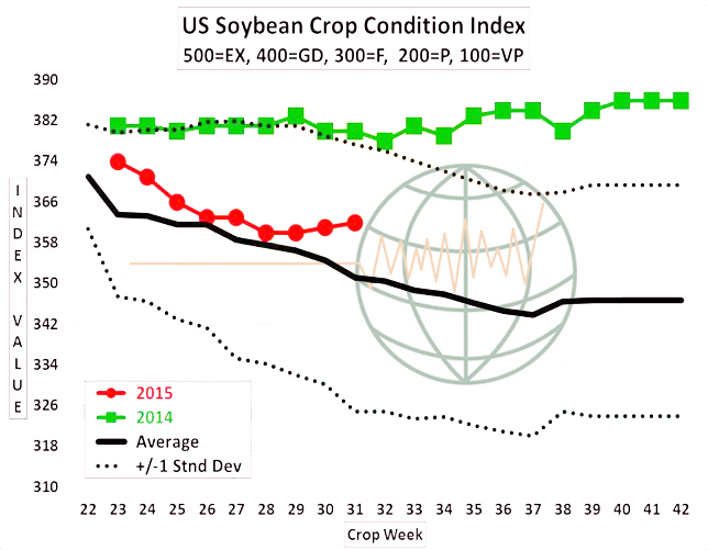 - US soybean good/excellent ratings rose 1% to 63%. The sunshine, warmer temperatures and rain across the W Midwest has helped US soybean yield potential. Note that seasonally US soybean ratings tend to decline from early July into August. Such a decline in ratings has not occurred this season, which argues for US soybean yields rising to near or above trend levels. If the ratings keep rising into mid-September due to favourable weather, the US can still produce a 2015 US soybean yield above 46 bushels/acre. Such production with a fall in US soy exports could lift 2015/16 soybean end stocks to 500 million bu or more.