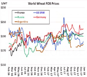 - Argentine FOB wheat prices are once again the cheapest in the world as the US market has turned higher following the current arctic chill and potential freeze damage that may have harmed the Plains HRW crop. Notice in the graphic below, US SRW wheat prices are still well below all other world exporters, which offers the potential for additional gains. We would note that European wheat exports to date are exceptionally slow, and at some point when French farmers start to unload their stored cash wheat, the EU will become a more aggressive world wheat exporter. US cold weather cannot bull the world wheat market it seems.