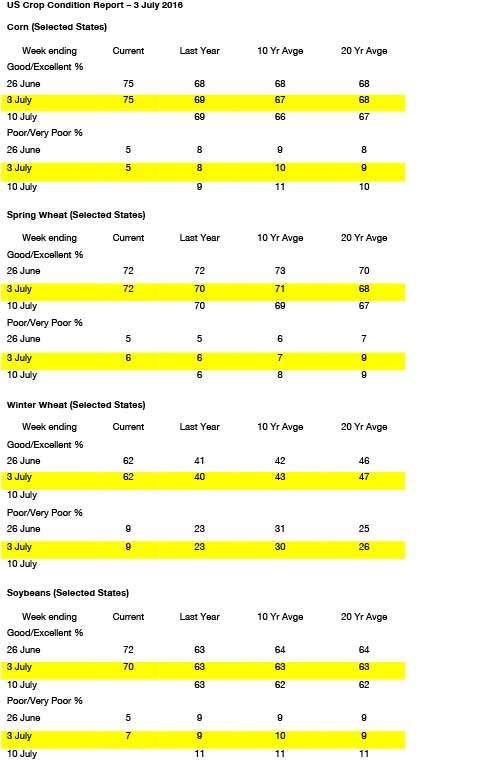 - Soybeans and meal keyed off of a deep break in Chinese meal prices overnight and gapped lower at Tuesday’s open. The sharply lower open was followed by technical selling/liquidation that had both beans and meal trading to limit losses. After the close, the Crop Progress report showed that 70% of the US soybean crop was rated as either good or excellent, down from 72% last week, but still well over last year’s 63%. Overall, crop ratings declined in 8 states, increased in 5 states, and were unchanged in 5 states. The best rated soybeans in the country are found in WI and the lowest are in MO and AR, but as a whole, the US soybean crop is still the 6th best rated crop on record, and assuming minimal changes over the next three weeks, yield models shows an August yield of 48 bushels/acre. November soybeans are back testing the May high, and our outlook has turned neutral on this break. Chinese soybean demand has been unrelenting, and US export demand will be strong in the coming months.