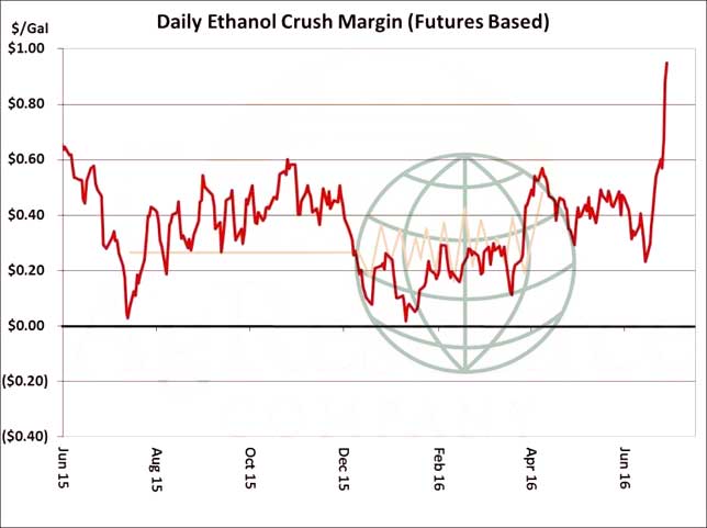 - US ethanol margins have soared on this price break with corn prices dropping nearly $1.00/bu in just the past two weeks. Near normal Central US weather and sticky cash ethanol prices have supported the big surge. Look for US ethanol plants to ramp up production amid $1/gallon margins. US corn yields have yet to be determined, but strong ethanol and livestock margins are likely to place a bid under spot corn prices.