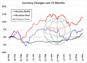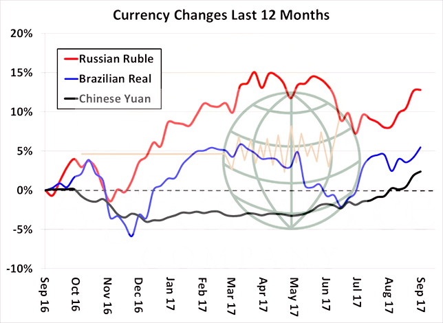 - World currency markets remain dominated by a falling US$ and strength elsewhere, as signs of economic growth reappear in emerging markets and as political uncertainty in the US does no favours for the US$. The graphic below shows that, in the last 12 months, the Russian ruble has rallied 12%, the Brazilian real is up roughly 5%. Even China’s yuan has recovered from early-year losses. Purchasing power in major importing countries is rising, albeit slowly, and the rally in major exporting currencies may work against further acreage expansion in 2018.