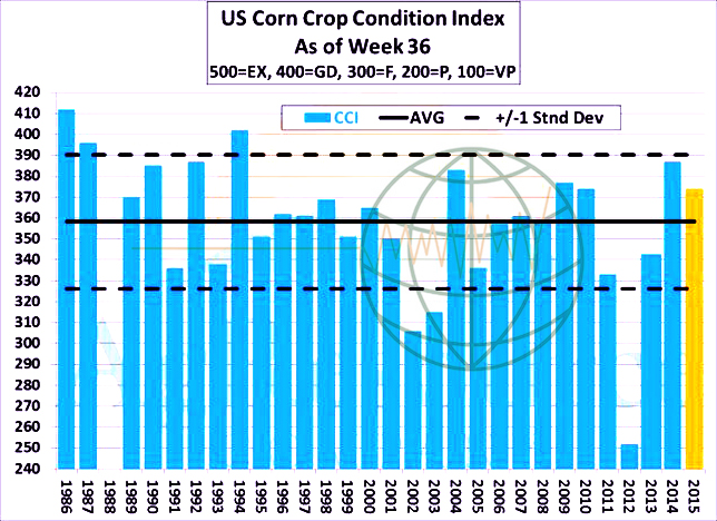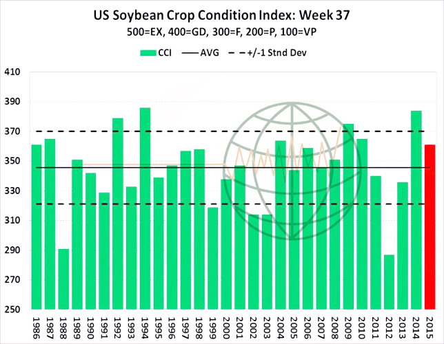 - Primary data, which the market has been trading, is a reduction in corn production and a boost in 2015/16 soybean output. Soybean yield was increased a touch to 47.1 bushels/acre vs. 46.9 in August with a corresponding increase in output. Corn yield was reduced to 167.5 bushels/acre vs. 168.8 in August, again impacting overall output. Wheat was left pretty much unchanged as NASS will update final wheat figures in the 30 Sep small grains report.