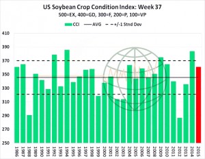 - Good/excellent US corn condition ratings were unchanged this week at 68%. Ratings boosts in IN, IA, PA and WI offset losses in KS, MO, NE and NC – conditions have countered the seasonal downward trend once again this year. The crop is 35% mature, vs. 25% a year ago, and is 5% harvested, vs. 4% a year ago. Progress will accelerate in the weeks ahead amid a lack of widespread rain and abnormally warm temps. Early yield results have been highly variable, but it’s far too early to establish a US trend, and key will be actual data from the Western Corn Belt, which is expected in the next two weeks.