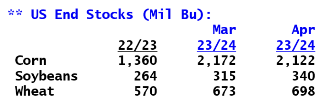 • Exporter wheat stocks increased 1 million to 61.6 million mt. 2023 European production was raised 500,000 mt. Stocks in Kazakhstan were increased 500,000 mt amid lower projected export demand. That US and exporter stocks were lifted isn’t bullish of price today, but nothing in USDA’s April report was market changing. We maintain that the exporter balance sheet tightens in crop year 2024/25 amid reduced carryover and as production will be steady/lower amid lost winter acres in the US and W Europe. The duration of dryness in the US Plains and Black Sea remain top priority.