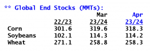 • Global end stocks of corn, soybeans and wheat were virtually unchanged from March with only modest adjustments in demand. Global corn and soybean stocks are large, but wheat stocks are forecast to decline in 2024/25. The USDA April reports will not hold the attention of the market beyond today. Unfortunately, choppiness is likely to persist until there is a clear supply risk via weather.